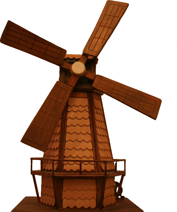 Auf den ersten Blick sieht dieses Modell wie ein sehr vereinfachtes kleines Abbild einer Galerie-Windmühle aus. Dieses "Mühlen-Modell" dürfte für jeden Mühlenfreund an warmen Sommertagen eine Freude sein: Es ist ein Ventilator - kein Gerät das den Wind nutzt, sondern das Wind macht. Hin und wieder tauchen diese Schmuckventilatoren im Handel auf. Wenn die Geschwindigkeit der Flügeldrehung auf die maximale Einstellung gestellt wird, dann fällt es auf: Keine echte Windmühle hätte diese Umdrehungszahl erreicht - es wäre auch viel zu gefährlich gewesen. Auch die "Windmühlen" von heute, die Windkraftanlagen drehen nur bis zu einer bestimmten Geschwindigkeit.