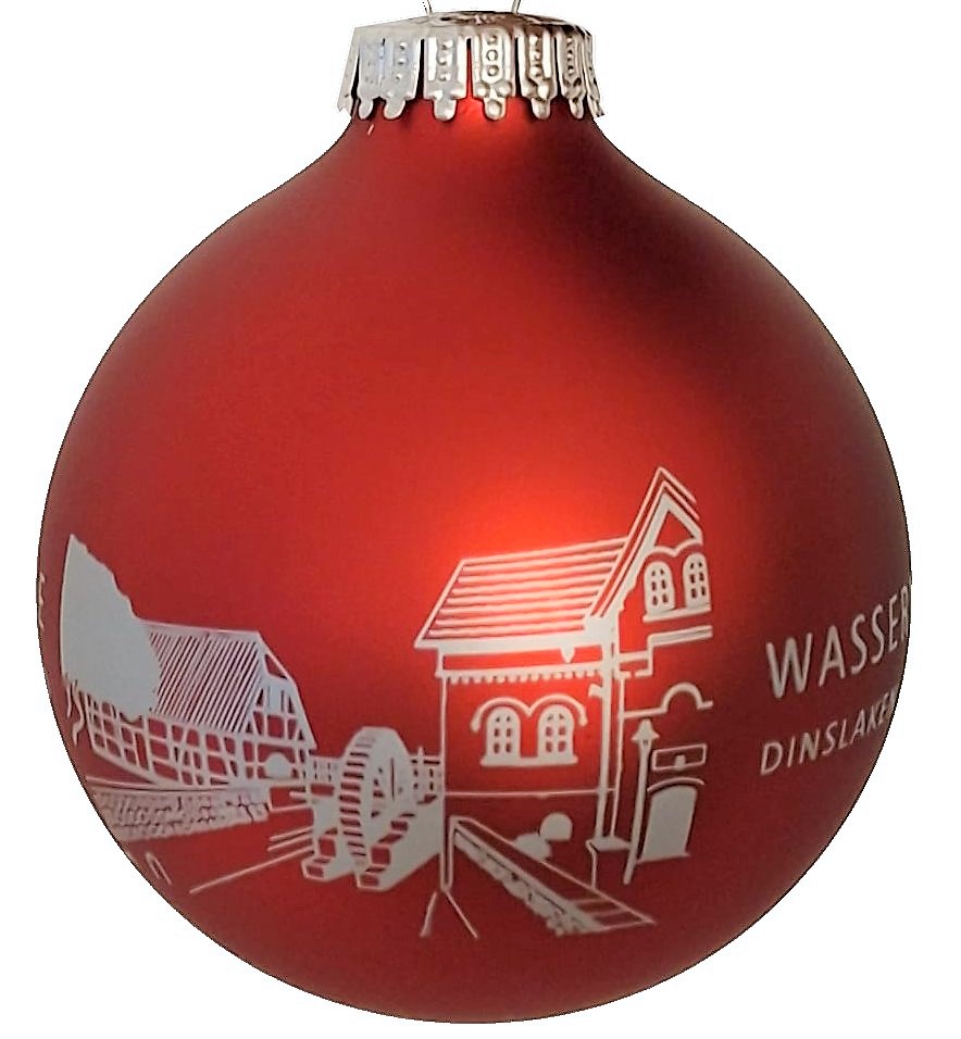 Das Motiv der diesjährigen Tannenbaum-Kugel zeigt unsere Wassermühle und gehört damit in die Sammlung Dinslakener Motive, hergestellt von der Fa. Jonkmanns |