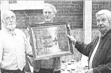 Einer Einladung von Kurt Altena zum Mühlenmuseum folgten Mitglieder der IGBCE-Ortsgruppe Hiesfeld. Ortsgruppenvorsitzender Thomas Giezek (li.) bedankte sich bei Kurt Altena mit einer Statue der Hl. Barbara u.a. im Beisein von Hermann Umbreit, Reinhard Baum, Lothar Bruckmann, Heinz Müller, Heinz Ulm, Manfred Trillenberg, Willi Banning, Alfred Weigang, Heinz Siemenowski (Mühlenverein), Helmut Fengels (ehemaliger Betriebsratsvorsitzender des Bergwerk Lohberg) und Hans Schott (ehemaliges Betriebsratsmitglied des Bergwerkes Lohberg).NRZ 28. Juni 2001 |