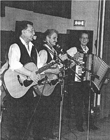 Klompen-Dänzer auf die kleine Bühne der Schulaula, In hübschen Trachten boten sie traditionelle Tänze. „Wir sind stolz, bei dieser Jubiläumsveranstaltung dabei zu sein", berichtete der Trainer der Klompen-Dänzer, Hans-Bernd Schürmann und gab anschließend einen kleinen Einblick in die Hiesfelder Geschichte, wenn das Dorf nicht nach Dinslaken eingemeindet worden wäre. „Da hätten wir nämlich zur 725-Jahr-Feier nach Dinslaken fahren müssen, und so kommt der Bürgermeister zu uns. Daher finden wir diese Lösung auch nicht schlecht."       Für mächtig viel Stimmung im Saal sorgte der Auftritt des Niederrhein-Trios. Die „frommen Drei vom Niederrhein" präsentierten ihre bekannten Lieder mit Texten rund um Dinslaken und Hiesfeld. Spätestens bei „Hiesfeld ist schön" (hören Sie einen Ausschnitt - klick unten auf PLAY) sangen alle Zuschauer mit und schunkelten zur Melodie. Viel Applaus erntete auch der Mandolinenverein „Harmonie" aus Barmingholten.