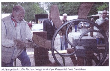 Naturstoffe auch am Stand des Heimatvereins Wegberg-Beeck. Volker Weyers demonstriert die vielen Arbeitsgänge, die eine Pflanze zum Küchentuch werden lassen. Im Mittelalter blühten Flachsanbau und Leinenproduktion am Niederrhein, seit 25 Jahren lassen die Wegberger die alte Tradition wieder aufleben. Weyers reißt den Flachs büschelweise aus seinem Feld. Dann wird er luftdicht gewässert. Die Pflanze gleicht der berühmten "Wollmichsau". Innen aus Holz, das in Flachsbreche und Flachsschwinge zu Span zerkleinert wird.