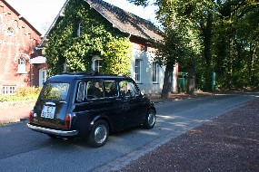 67 Young- und Oldtimer passierten die Hiesfelder Wassermühle. Einige Fahrer nahmen sich die Zeit, für ein Photo mit Mühle und Auto, Danke. |